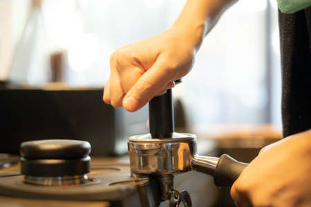 Close-up view on hands,Asian woman barista using tamper to press ground coffee into portafilter to make espresso hot drink