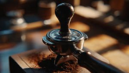 Man is using a tamper to press freshly ground morning coffee into a coffee tablet