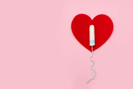 Tampon lying isolated on red background with text period. Concept women sanitary protect