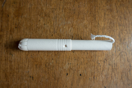 Single tampon with cardboard applicator on wooden table from above