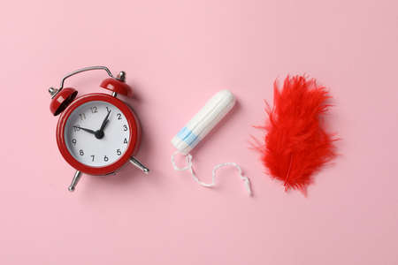 Tampon, alarm clock and feather on pink background, space for text
