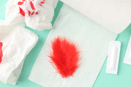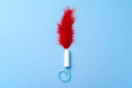 Feminine sanitary napkin with a red feather on a blue background. Concept of womens menstrual days.