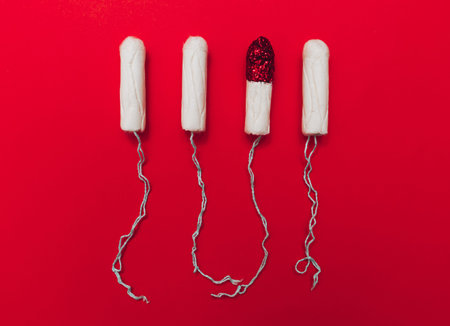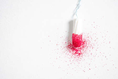 White womens tampon on white background and red glitter pigment. Concept photography for womens or feminist blog