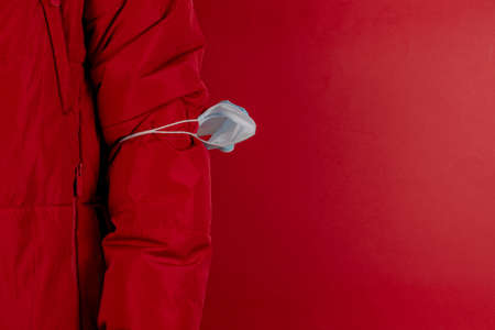 man in red jacket is using a protective mask against corona virus on red background, red color symbol of high alert and stop sign against the disease, COVID-19 SARS