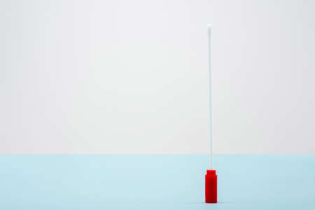 top view of test stick on blue and grey background, omicron variant concept