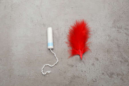 Tampon and red feather on gray background, flat lay. Menstrual hygiene product