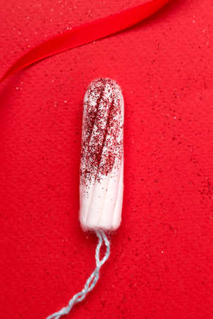 White women's tampon on white background and red glitter pigment. Concept photography for women's or feminist blog . High quality photo