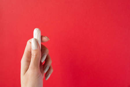 Closeup female hand holding a tampon. Concept women sanitary protect
