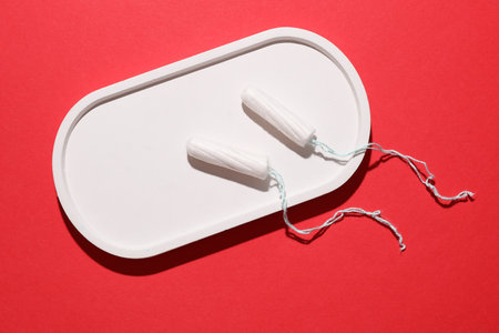 Tampons for feminine intimate hygiene in tray on red background. Menstruation, critical days, female cycle