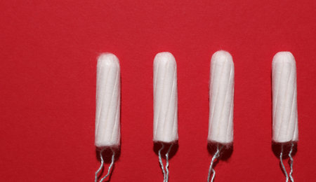 Menstrual period concept. Woman hygiene protection. Women's health. Cotton tampons on red background.