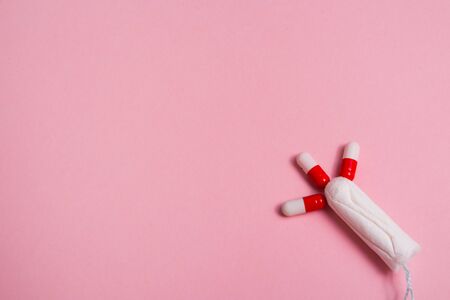 Female medical tampons and painkiller pills top view
