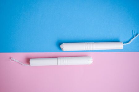Hygienic tampons on a blue and pink background. copy space, Menstruation sanitary tampon for woman hygiene protection. Critical days. Medical conception on the blue background, daily, menstrual woman
