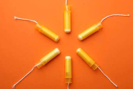 Women tampons on orange background, top view