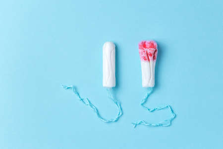 Medical female tampons. Menstruation, means of protection. Used and new tampon over blue background with place for text