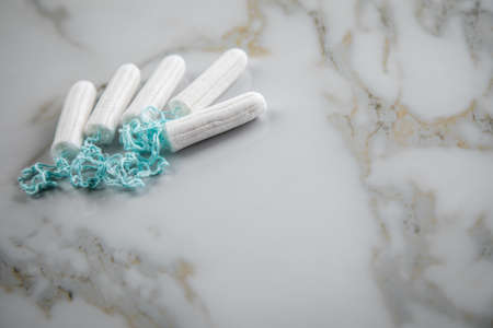 Tampons on marble background for female personal hygiene and protection during menstruation period cycle