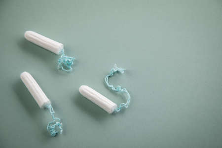 Tampons on green mint background for female personal hygiene and protection during menstruation period cycle