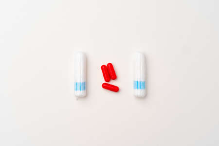 menstrual cramps medication. mix of pills and tampons on white background.