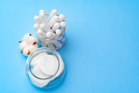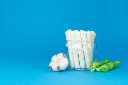 The concept of the menstrual period. Protection of feminine hygiene. Cotton tampons on a blue background. Top view, flat lay