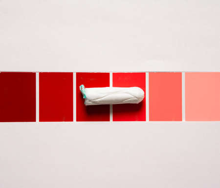 Soft white women's tampon on palette of shades of red. Close concept photography for a women's or feminist blog or ad. High quality photo
