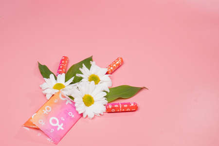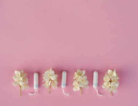 Women's and gynecological health care. menstrual cycle. Hygiene care during critical days. Tampon and female paddingwoman Clean lie on a pink background among white flowers, safe Menstruation, means of protection.