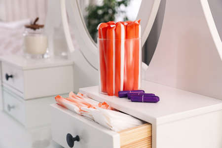 Dressing table with different feminine hygiene products indoors
