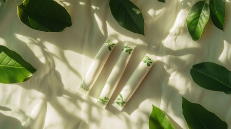 Natural herbal sticks arranged on a soft surface with vibrant green leaves around them