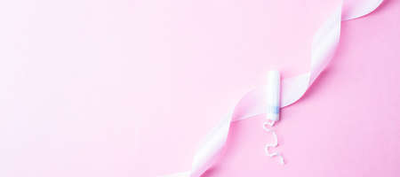 Menstrual tampon feminine hygiene. Pink ribbon with menstrual tampon on pink background. Menstruation feminine period. Sanitary hygiene concept. medical healthcare gynecological banner
