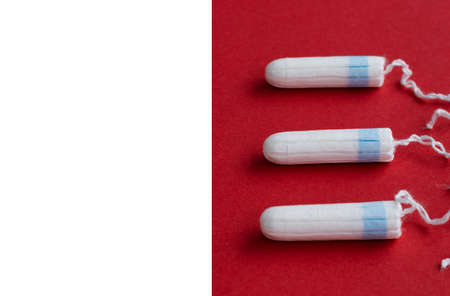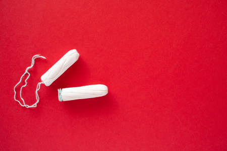 Tampons for feminine intimate hygiene on red background. Menstruation, critical days, female cycle