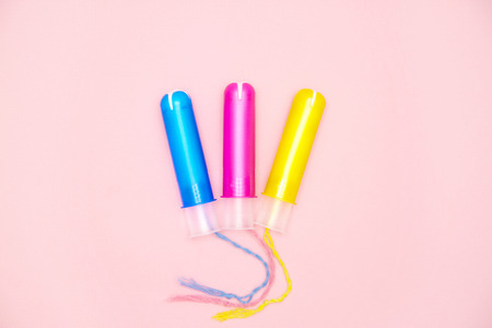three cotton tampons with blue pink yellow applicartor on pink background. Menstrual cycle period concept. Woman days hygiene protection. Top view, flat lay.