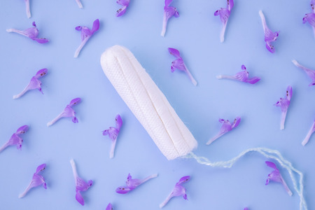 tampon on a blue background. The view is flat. Concept of critical days, menstruation