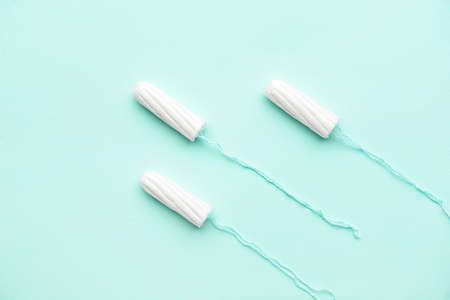 Three Menstrual tampons on a blue background. Menstruation cycle. Hygiene and protection. Disposable tampon. PMS.