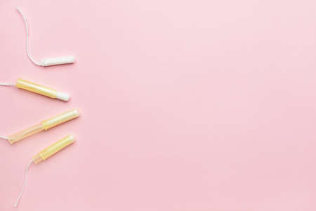 Gynecological tampons on a pink background top view, free space