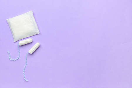Menstrual pad and tampons on purple background