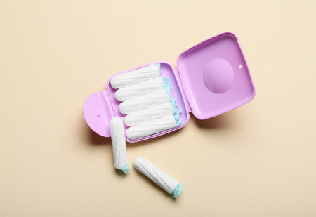 Tampons storage box on beige background