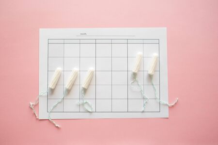 PMS and the critical days concept.monthly calendar for menstrual, PMS marks. personal care products, pink background