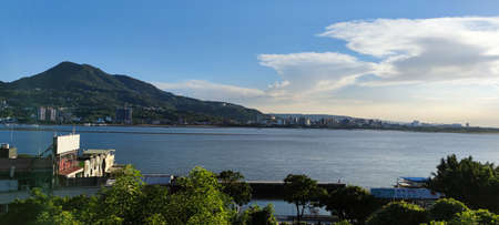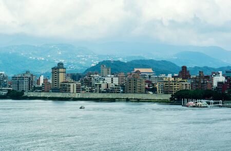 TAIWAN-Sep 8, 2021: City Tamsui Bali District in Taipei, Taiwan reflecting in the Tamsui River at nice day