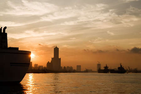 City silhouette of buildings in morning with golden sunlight and water in Kaohsiung, Taiwan.