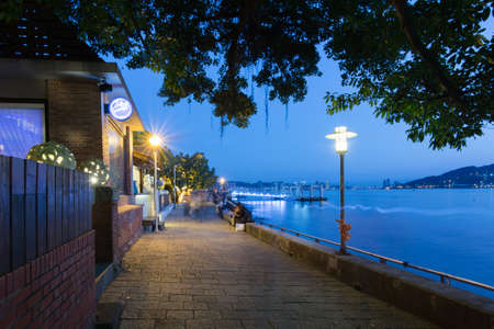 Sanya, Hainan, China - 7.07.2019: Night view of Phoenix island and Sanya city illuminated with city lights. View from Luhuitou Park on Hainan Island in China