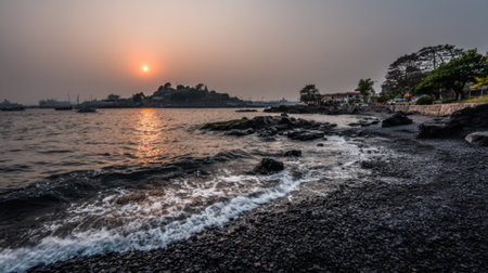 A beautiful and tranquil coastal scene during a hazy sunset. The sun casts a warm glow on the water as gentle waves wash over the dark, rocky shore.