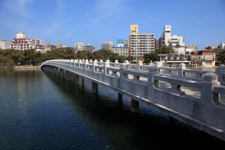 Kaohsiung, Taiwan - OCT 16, 2021: Temple railing in Dragon and Tiger Pagodas.