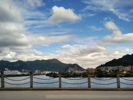 On cloudy days, there are fast moving clouds over the Tamsui River. The buildings overlooking Tamsui from the left bank of Bali, New Taipei City.