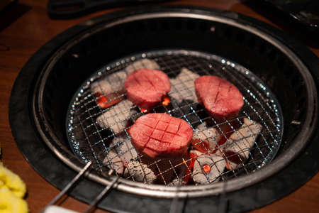 Grilled raw meat beef and pork (barbeque, bbq) a food cooking on wagyu grill in BBQ. yakiniku grill buffet restaurant