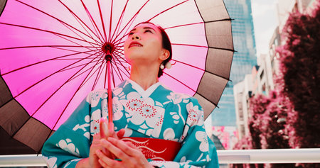 woman in yukata (kimono dress) holding umbrella and folding fan and looking sakura flower or cherry blossom blooming in the garden