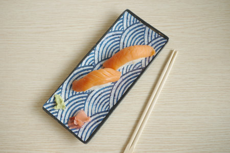 Japanese food delicacy consisting sashimi salmon of very fresh raw salmon fish sliced into thin pieces serving with radish sliced in japan restaurant