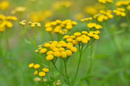 Tansy Tanacetum vulgare, golden, bitter buttons yellow flowers in meadow closeup selective focus