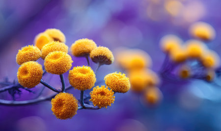 yellow tansy flowers , round flowers in full bloom contrast against a blurred green background