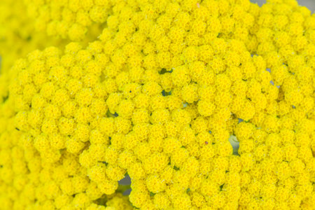 Achillea filipendulina - common names yarrow, fernleaf yarrow, milfoil, nosebleed - is an Asian species of flowering herbaceous perennial plants in the sunflower family, native to central and southwestern Asia. Top view, macro shot, close-up, yellow background