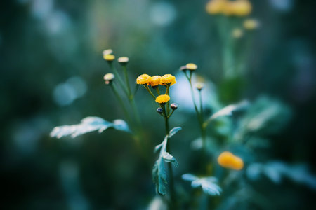 Common tansy, wild field dark green plant with yellow small flowers in the forest outdoors. Low key, close up.