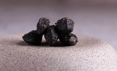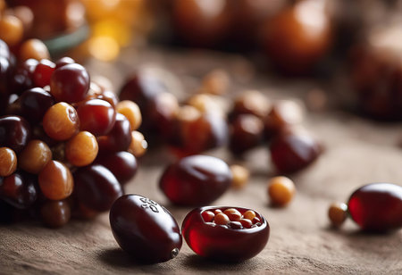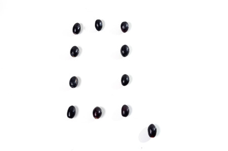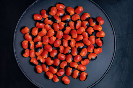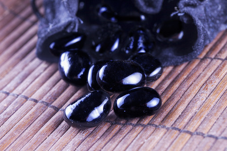 Lot of whole shiny black bean with brown ceramic coaster isolated on black glass