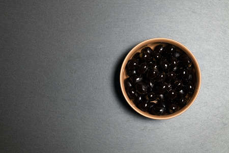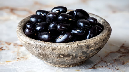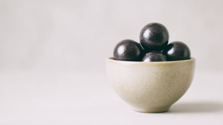 A stylish bowl contains glossy black spheres, perfect for showcasing on a kitchen counter or as an artistic centerpiece. Ideal for culinary photography or lifestyle content.